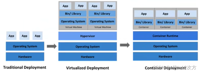 本章节主要介绍应用程序再服务器上部署方式演变以及kubernetes的概念、组件贺工作原理。kubernetes,是一个全新的基于容器技术的分部式架构领先方案,是谷歌严格保密几十年的秘密武器——Brog系统的一个开源版本,于2014年9月发布第一个版本,2015年7月发布第一个正式版本kubernetes的本质是一组服务器集群,它可以在集群的每个节点上运行特定的程序,来对节点钟的容器进行管理。自我