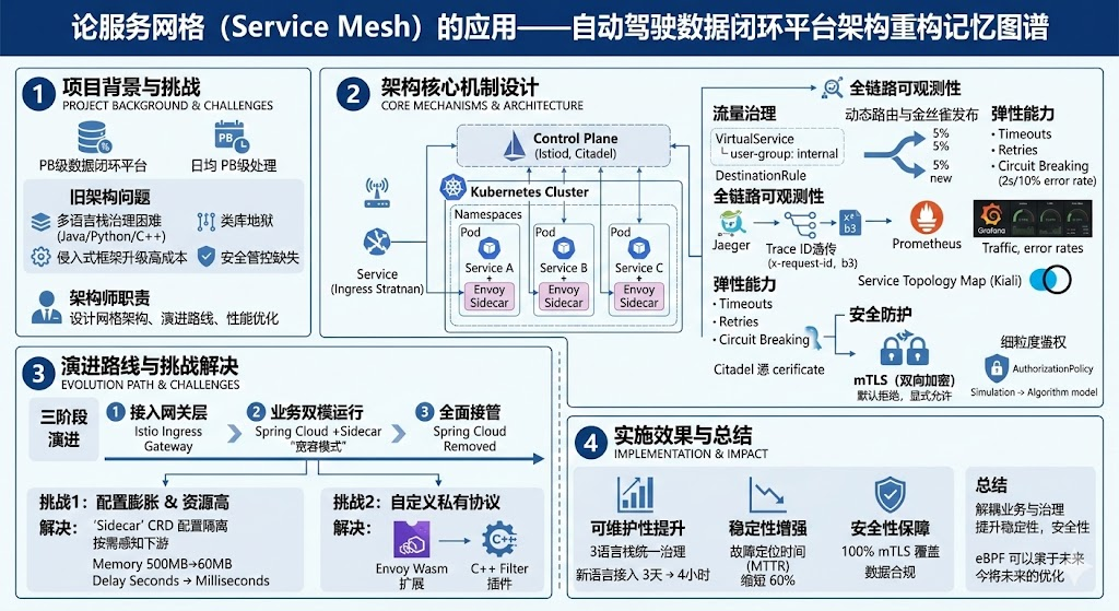 【摘要】本文以某造车新势力"分布式自动驾驶数据闭环平台"架构重构项目为例,阐述了服务网格技术的应用实践。针对原SpringCloud架构在多语言治理、框架升级和安全管控方面的痛点,项目团队引入Istio服务网格实现治理逻辑与业务解耦。通过Sidecar代理模式构建了非侵入式流量治理、全链路可观测性和mTLS零信任安全三大核心能力,并采用三阶段平滑迁移策略确保系统稳定性。实施过程