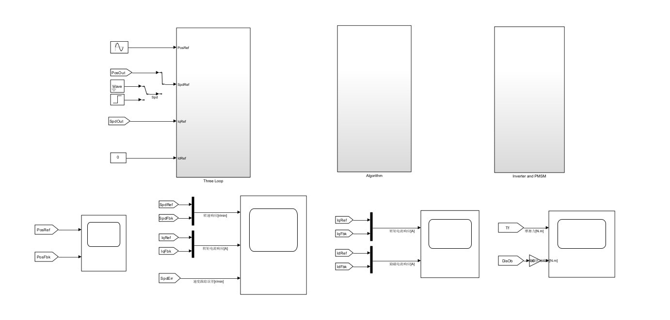 仿真中主要包含抗饱和PI控制器、摩擦力模型、分数阶扰动观测器、坐标变换、SVPWM、逆变器和永磁同步电机模块等,其中抗饱和PI控制器、摩擦力模型、分数阶扰动观测器、坐标变换、SVPWM模块均采用matlab function编程实现,其与C语言编程较为相似,容易进行实物移植。由于摩擦力的存在,实际速度过零时不能很好的跟踪速度给定信号,如图1所示,0.5s 前没有使用分数阶扰动观测器,速度过零时,速