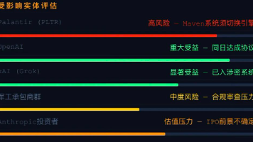 2026年2月,特朗普政府全面封杀AI公司Anthropic,国防部长Hegseth将其列为"供应链安全风险"——这一标签此前仅用于华为等外国实体,首次针对美国本土企业。导火索是Anthropic拒绝移除Claude模型"不用于大规模监控"和"不用于全自主武器"两条红线。讽刺的是,OpenAI同日与五角大楼达成协议,却保留了完全相同的红线。这场冲突本质是政治博弈而非安全分歧,xAI、Palanti