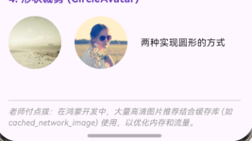 本文深入解析Flutter的Image控件在HarmonyOS NEXT开发中的应用,涵盖图像加载、排版优化和视觉特效三大核心内容。文章详细介绍了四种图像来源(网络/本地/文件/内存)、BoxFit排版属性(cover/contain/fill等)、加载状态处理以及高级视觉效果实现(滤镜/裁剪/混合)。特别针对鸿蒙设备优化,提供了网络图片缓存方案和内存管理技巧,通过控制解码尺寸提升性能。最后指出图