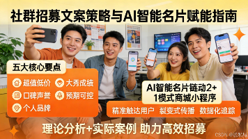 本文探讨私域流量运营中社群招募文案的5个核心要点:超值低价、大秀成绩、口碑声誉、个人品牌和预期可控。这五个要素构成吸引关注-强化信心-建立信任-凝聚认同-促成决策的完整说服逻辑链。研究指出AI智能名片链动2+1模式商城小程序能有效支撑各要点的落地,通过优惠设置、数据可视化、口碑传播等功能,实现招募文案的优化升级。未来随着技术发展,该模式将向精准推送、个性化定制方向演进,为社群招募提供更高效的数字化