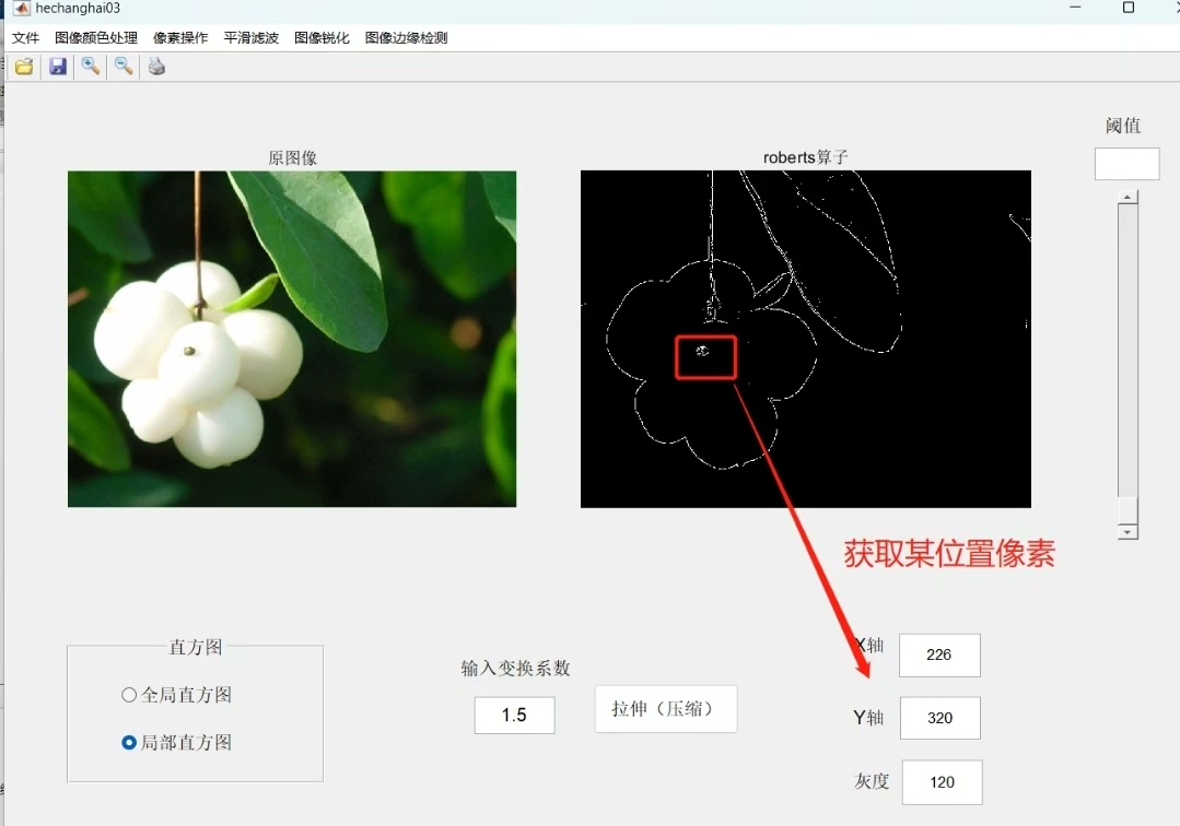 基于matlab GUI的图像处理,功能包括图像颜色处理(灰度图像、二值图像、反色变换、直方图、拉伸变换);像素操作(读取像素、修改像素)、平滑滤波(均值平滑、高斯平滑、中值平滑)、图像锐化(robert交叉梯度锐化、sobel梯度锐化、拉普拉斯锐化)、图像边缘检测(拉普拉斯算子、sobel算子、prewitt算子、roberts算子、canny算子)。通过GUI以可视化的形式展现。数据可更换自己