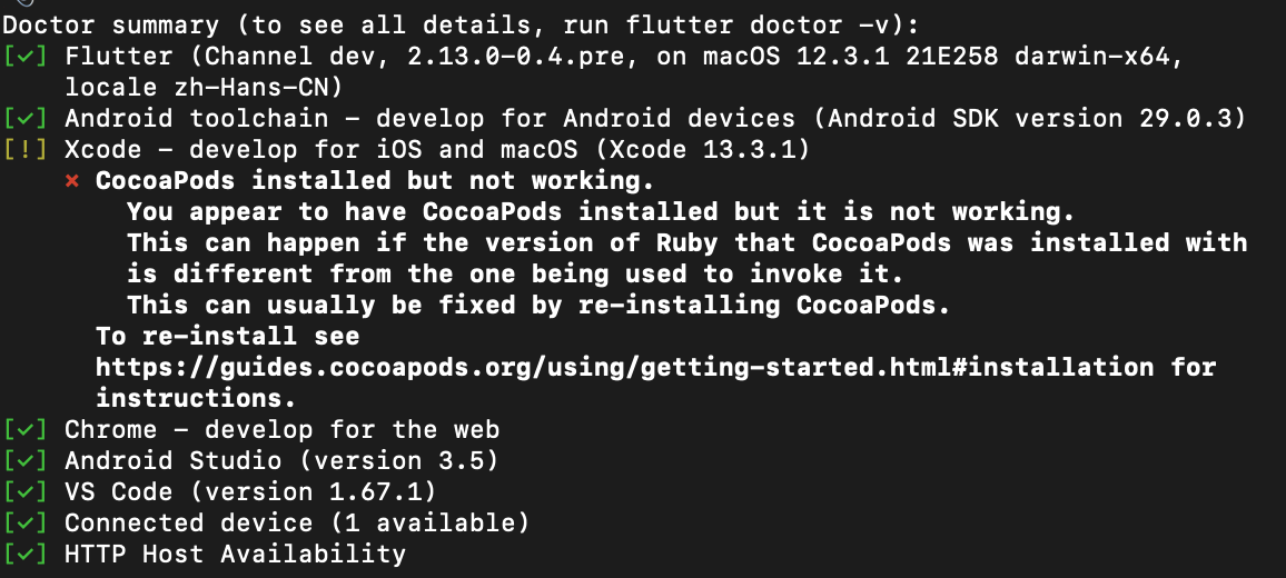 今天给一台刚升级过12.3.1系统的Mac电脑搭建Flutter环境,遇到一个问题,卡了好几个小时,顺带记录一下。基础搭建就不说了,这里只说遇到的问题,当我执行sudo flutter doctor的时候,报了下边这个错误:CocoaPods installed but not working.You appear to have CocoaPods installed but it is not