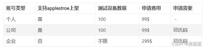 本文转载自:苹果开发者账号和证书那些事 - 简书1、 苹果开发者账号有四种类型,分别是:个人开发者账号:99$一年,可以在AppStore上架,并且在app后面显示个人ID;每年最多只能添加一百个苹果设备对app进行真机调试;只要付费就可以申请;一般是个人使用或者小公司偶尔使用(AppStore显示的是个人名字,不是公司名)。企业开发者账号:299$一年,不可以在AppStore上架(所以也就不需
