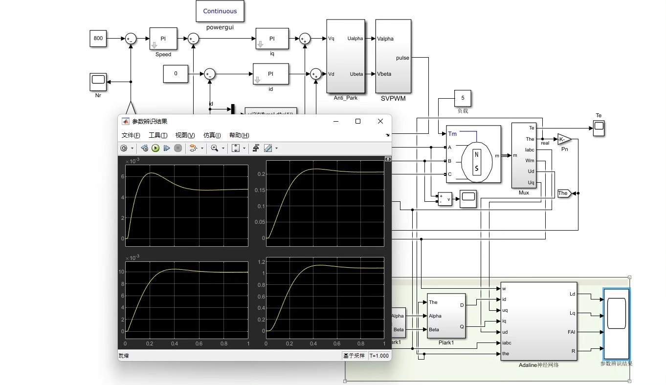 永磁同步电机adaline神经网络在线参数辨识。有参考文献。辨识电阻,电感,磁链。永磁同步电机的参数辨识就像给电机做体检——电阻、电感、磁链这些关键指标直接关系到控制系统的"健康状态"。传统离线辨识方法遇到工况变化就抓瞎,这时候Adaline神经网络带着在线学习能力闪亮登场。这货比传统BP网络简单粗暴得多,单层结构+线性激活函数,实时更新权重不拖泥带水,特别适合嵌入式系统落地。先看电机本体数学模型