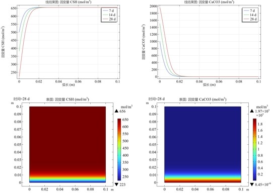 【模型】:混凝土碳化模型,使用PDE建模。【软件】:COMSOL【模块】:PDE模块(系数偏微分方程)【类型】:复现某硕士论文(碳化模型)【物理场景】:研究荷载作用下混凝土碳化情况,考虑温度,相对湿度,载荷及孔隙度变化的影响。下图为试块7天,14天及28天时各组分浓度含量及碳化深度,组分包括二氧化碳,氢氧化钙CH, 水化硅酸钙CSH以及碳酸钙等摩尔浓度含量变化。【复现效果】:基本复现,论文中所有偏
