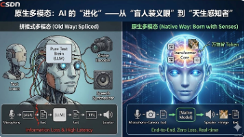 原生多模态(Native Multimodality)是大模型发展的新范式,指模型从设计之初就具备同时处理文本、图像、音频、视频的能力。与传统的拼接式多模态(需外接视觉/语音模块)不同,原生模型将各类数据统一转化为Token直接处理,实现端到端学习。这种架构能保留原始信息(如语音情感),支持跨模态推理和任意输入输出组合。代表模型包括GPT-4o(实时交互)、Gemini1.5(长视频理解)等。原生