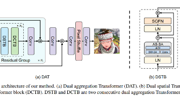 本文提出了一种双重聚合Transformer(DAT)用于图像超分辨率重建。DAT通过块间和块内的双重方式在空间和通道维度上聚合特征:块间采用交替堆叠的空间-通道Transformer块实现信息互补,块内则通过自适应交互模块(AIM)和空间门控前馈网络(SGFN)实现特征融合。AIM通过双向交互操作(空间交互S-I和通道交互C-I)将全局自注意力与局部卷积特征深度融合;SGFN则利用空间门控机制增