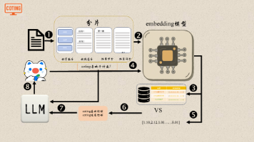 最后我们再来回顾一下RAG的整体流程,首先外部文档进行分片,便于后续存储和检索,之后把分片之后的文档输入embedding模型,embedding模型把他们编码成固定长度的向量存储到向量数据库中,当用户提出问题时,会用相同的embedding模型把问题编码成固定长度的向量,之后把问题向量和向量数据库中所有向量进行比较,进行召回和重排之后得到相关的内容,最后,把用户最开始的问题和得到的相关内容合并一