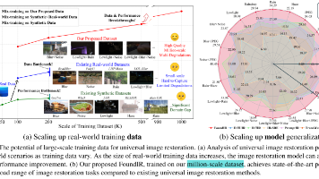 本文提出FoundIR,一个面向真实场景的图像恢复基础模型。通过构建包含100万对图像的多样化数据集(涵盖20种退化类型),并设计基于扩散模型的通用框架,结合增量学习策略和专家模型,有效解决了大规模数据训练中的灾难性遗忘问题。实验表明,该方法在多种退化场景下优于现有技术,为图像恢复基础模型的发展提供了新思路。