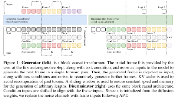 摘要:本研究提出自回归对抗后训练(AAPT)方法,将预训练视频扩散模型转化为实时交互式视频生成器。通过架构转换(采用因果注意力)和对抗训练策略,模型可实现24fps实时生成(736x416分辨率单H100,或1280x720分辨率8xH100),最长支持1分钟视频生成。实验显示其性能优于现有方法,但存在快速动作处理、长程记忆等局限。未来将优化架构、物理一致性和人类偏好对齐,扩展实时交互应用场景。论