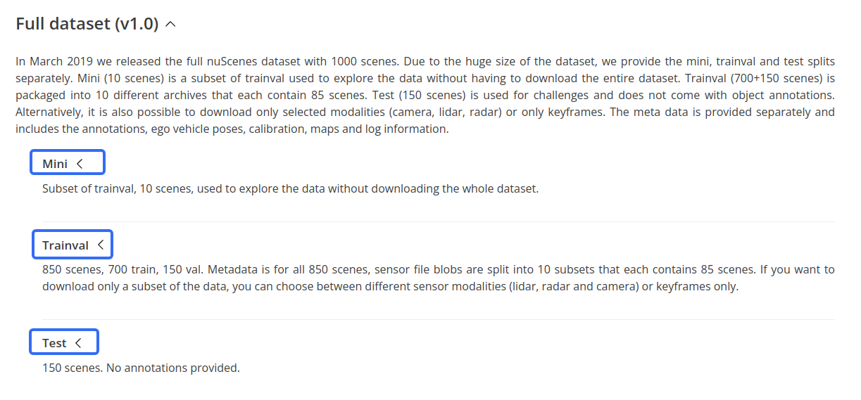 注意:根据你的cuda版本选择相应的版本,并注意它们之间的版本依赖关系。把Mini的压缩包都放在同一个目录,例如名为v1.0-mini,然后解压,解压的时候会有一些目录合并。把全量的压缩包都放在同一个目录,例如名为v1.0-full,然后解压,解压的时候会有一些目录合并。把v1.0-mini改名为v1.0-trainval,这样得到的目录是。需要下载TrainVal, Test和can_bus,得