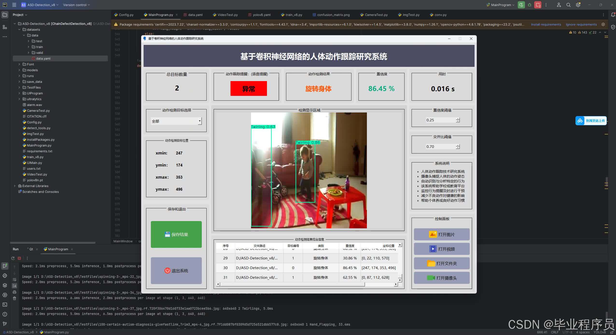 本研究提出了一种基于卷积神经网络和YOLOv10算法的儿童自闭症早期诊断方法。通过Python编程和PyCharm平台开发,系统实现了对儿童动作视频的精准跟踪与分析,构建了从数据预处理到特征分析的完整技术链条。相比传统主观诊断方式,该方案在客观性、效率和可重复性方面具有显著优势。实验结果表明,该方法在动作跟踪和自闭症诊断方面效果良好,为临床筛查提供了新思路。不过研究仍存在数据集规模有限、场景单一等