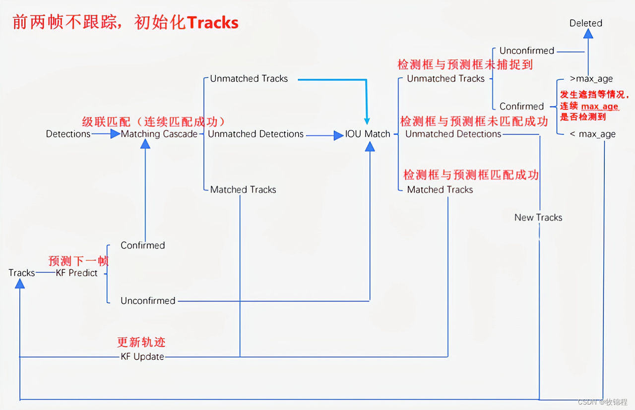 匈牙利算法是一种用于解决分配问题的有效算法。在DeepSORT算法中,匈牙利算法被用于解决数据关联问题,即如何将当前帧中检测到的目标(detections)与上一帧中跟踪的目标(tracks)进行匹配。DeepSORT通过计算检测框和跟踪框之间的相似度,构建一个代价矩阵,然后利用匈牙利算法找到最小化代价的匹配方案。初始化:当视频的第一帧被检测时,每个检测到的目标初始化一个跟踪轨迹。匹配。