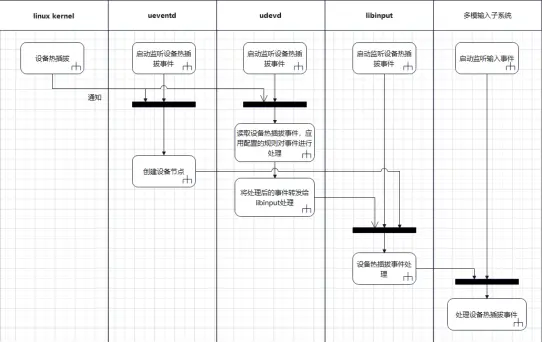 现有多模输入子系统框架中,设备原始输入事件要经由 libinput 处理,封装成 libinput 的事件类型。多模输入子系统接收并处理 libinput 封装的事件。特别地,libinput 依赖 udev 获得输入设备热插拔事件的通知。udev 将监听热插拔事件、读取热插拔的设备信息,连同枚举已加载设备等接口实现封装成 libudev 共享库。libinput 通过 libudev 封装的这些