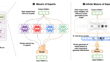 本文提出 ∞-MoE,它将 MoE 从有限的专家集合扩展到连续(实际上无限)的专家空间。它仅为每个 token 激活少数几个采样专家,保持了类似 MoE 的效率,同时提高了准确性。在 GPT-2 Small 和 Medium 上,∞-MoE 优于 Switch Transformer 和标准 MoE。