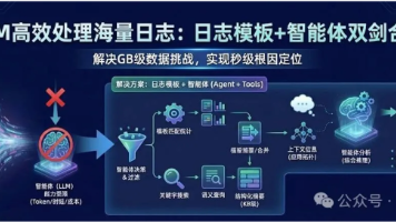 摘要:针对LLM处理海量日志的挑战,提出"日志模板+智能体"方案。通过模板匹配将GB级日志压缩为结构化摘要,结合关键字搜索保留关键细节,利用语义查询增强理解。采用Agent+Tools架构实现动态决策分析,支持按需调用工具组合。该方案有效解决日志数据量与LLM处理能力的矛盾,将原始日志从GB级压缩至KB级,使智能体能快速定位根因。典型场景中,智能体通过分析模板统计趋势和异常日志