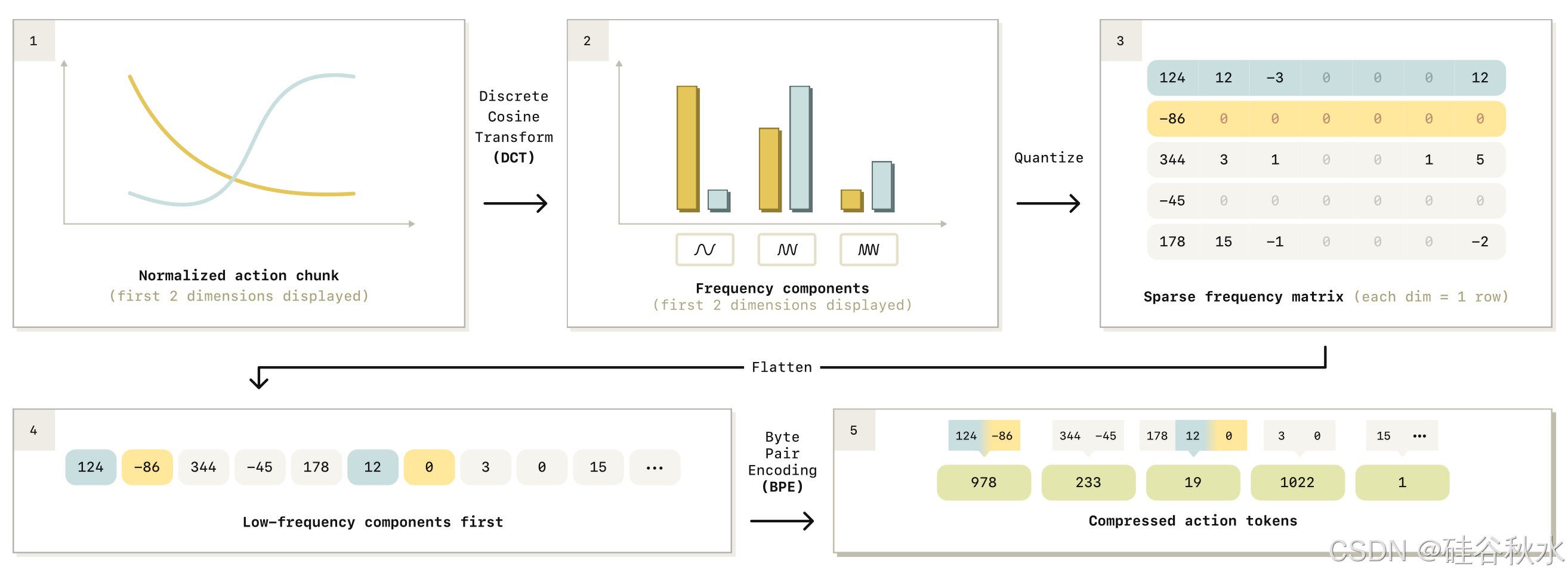 25年1月来自 PI 公司和伯克利分校、斯坦福一起撰写的论文“FAST: Efficient Action Tokenization for Vision-Language-Action Models”。自回归序列模型,例如基于 Transformer 的视觉语言动作 (VLA) 策略,可以非常有效地捕捉复杂且可泛化的机器人行为。然而,这样的模型要求选择连续动作信号的 token 化,这决定模型预