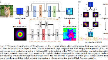 本文提出了一种名为 WaveFormer 的全新视觉骨干网络,旨在解决现有 Transformer 计算复杂度高以及基于“热传导”物理模型容易导致特征过度平滑的问题。核心思想是将特征图视为一种空间信号,利用**欠阻尼波动方程(Underdamped Wave Equation)来建模其随网络深度的演化过程。通过推导该方程在频域的闭式解,作者设计了 波传播算子(WPO),实现了频率与时间的解耦,使得