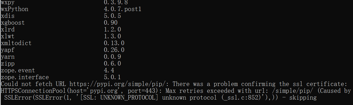 这个错误通常是由于网络连接问题或者代理设置不正确导致的。:由于pypi.org在国外,国内访问速度可能较慢,可以考虑使用国内的镜像源来替代。可以通过修改pip的配置文件来使用国内的镜像源。自己拔掉内网连接上自己手机开的热点外网服务器后,这个问题得到了解决。然后,自己按照上面介绍的方法通过修改pip配置文件后,问题也是得到了解决。今天要查询自己python3.6.8环境中已经安装的库包,使用pip