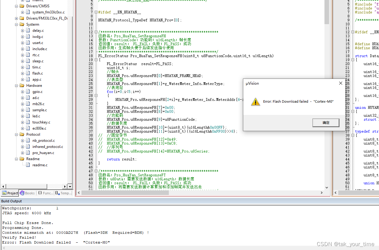尝试用小些(约38K)程序烧写可以烧写成功,使用大于40多K的程序烧录失败,可能是Flash损坏导致只能使用前30多K的Flash(笔者姑妄言之,具体需联系厂家实测)。进行全局编译,并无异常,烧录两台设备其中一台烧录正常,一台出现以下现象:即“content mismatch at :0x00XXXXXXX”复制一个工程文件,打开工程最后出现“contains an incorrect path”