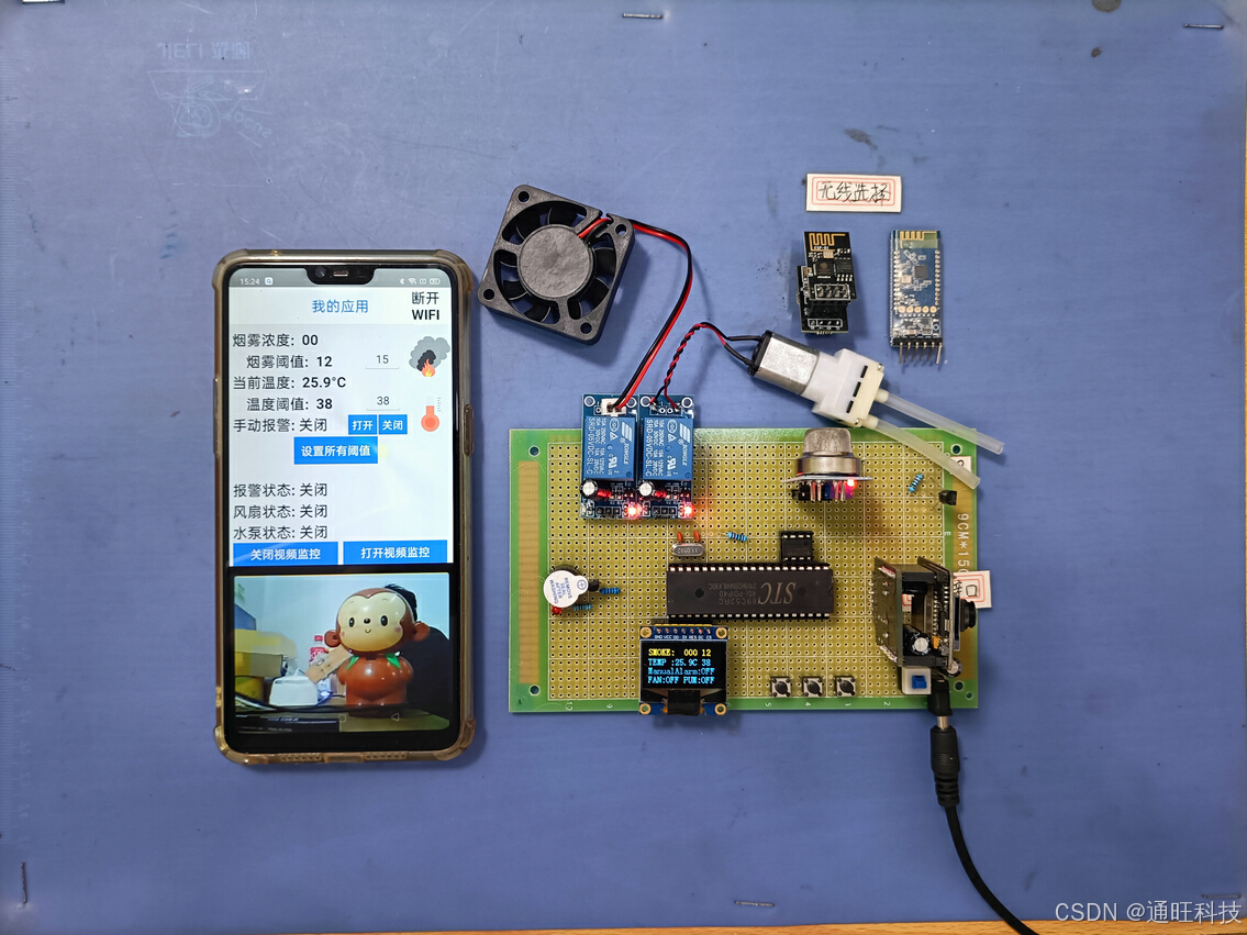51单片机+烟雾浓度+温度+水泵+风扇通风散热+阈值+OLED屏+声光报警/C12N51+蓝牙APP控制+烟雾+温度+水泵+风扇通风+阈值+OLED屏+声光报警/C12B51+WIFI-APP控制+烟雾+温度+水泵+风扇通风+阈值+OLED屏+声光报警/C12W51+视频监控+WIFI+烟雾+温度+水泵+风扇通风+阈值+OLED屏+声光报警/C12CAM产品功能描述:本系统由STC89C52单片机