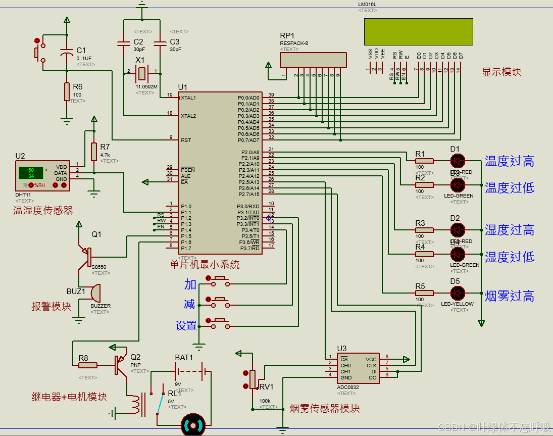 由STC89C52单片机+LCD1602液晶显示屏+ADC0832模块+蜂鸣器+DHT11温湿度传感器 +烟雾传感器+LED+按键构成具体功能:1、LCD1602液晶第一行显示当前的烟雾值,第二行显示当前的温度和湿度值;2、可以设置烟雾、温湿度上下限报警值。共4个按键:复位按键、减键、加键、设置键;设定的参数具有掉电保存,保存在STC单片机的内部,上电无需重新设置;3、当烟雾值高于设定的报警值或温