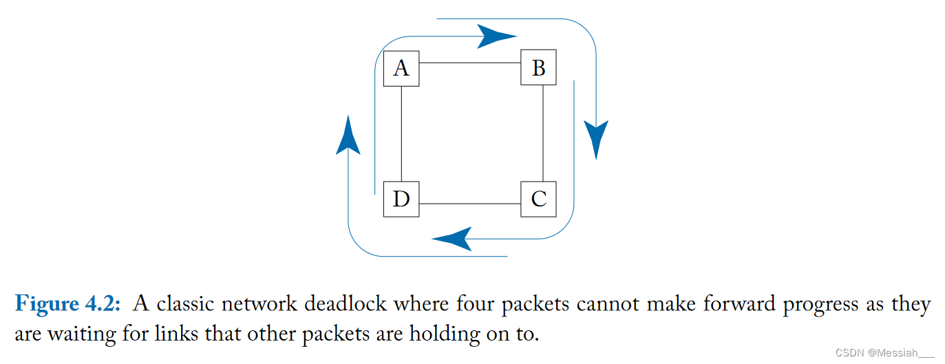 维度顺序路由 (DOR) 维度顺序路由是确定性路由算法的一个例子,其中从节点 A 到 B 的所有确定性路由消息将始终经过相同的路径。虽然路由电路本身的功耗通常较低,但特定的路由算法会直接影响到跳数,从而大大影响到消息传输的能量消耗。ABCD代表路由器网络节点,折线代表数据包流动方向,从节点A南侧输入的数据包需要从节点A的东侧输出端口离开,但与此同时,另一个正在B节点西侧输入端口的数据包占据着AB之
