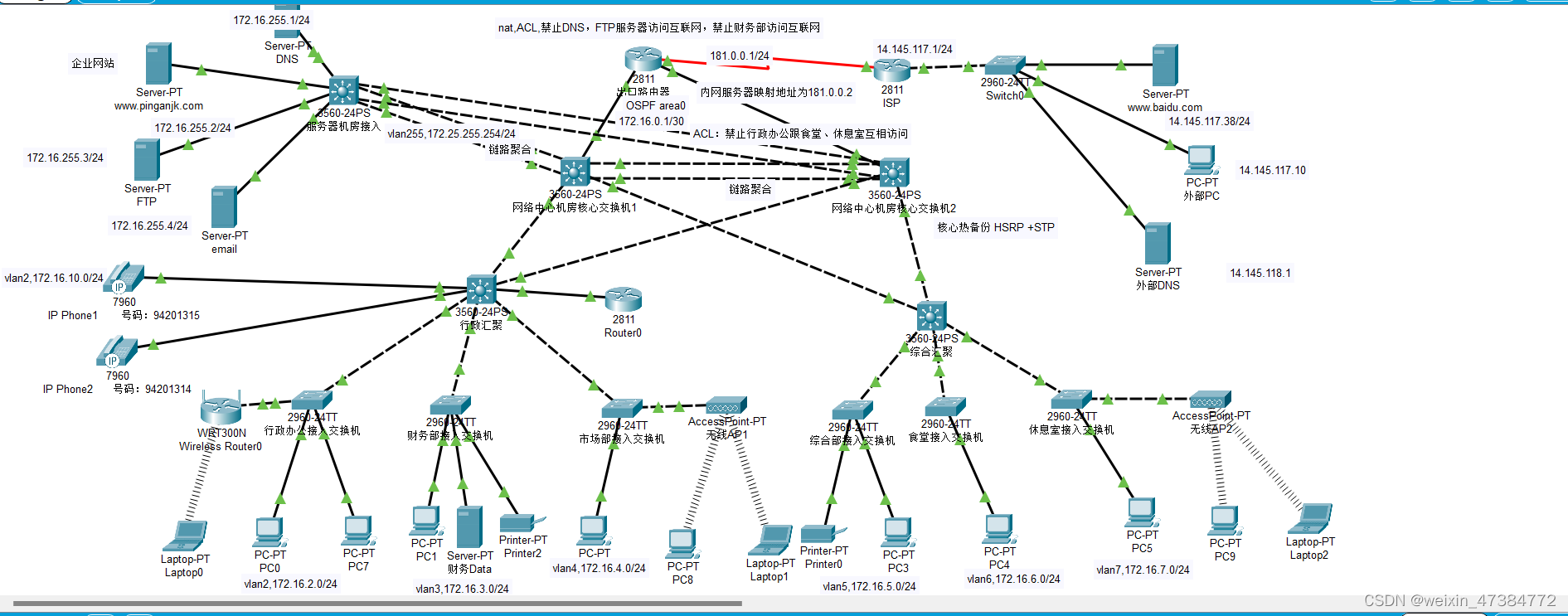 Cisco packet tracer 软件模拟实现双核心中型企业/校园网 网络设计。包含全部pkt文件 操作文档 技术说明 设计2w字文档设计技术动态 vlan ,nat,ospf ACL访问控制列表,HSRP备份冗余,服务器设计,动态主机配置协议(DHCP),生成树协议(STP),链路聚合。本视频的配置文件适用于多数毕业设计和课程设计!!!