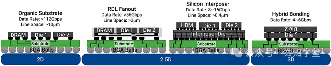 2.5D 封装采用 RRL 扇出技术,由于其能够桥接 2D 技术的低成本和硅中介层的密度,因此成为一种有吸引力的选择。用于诸如数据中心、人工智能 (AI) 训练或推理、服务器和网络等高性能计算 (HPC) 应用的高端 multi-die SoC,为了使用并行 die-to-die 接口,都充分利用了 2.5D 封装技术的密度和 RDL 扇出优势。基于芯粒设计模式来进行多芯粒系统设计时,系统架构师面