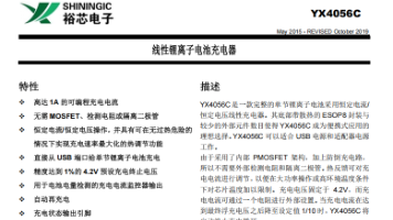 YX4056C是一款高性能单节锂离子/聚合物电池线性充电管理芯片,采用CC/CV充电算法,支持1A可编程充电电流。芯片集成功率MOSFET、热调节、反接保护和状态指示功能,适用于便携设备。关键参数包括4.5-5.5V输入范围、4.2V±1%浮充电压精度和145℃热保护。通过PROG引脚电阻可灵活设置充电电流,内置多重保护机制确保安全。典型应用涵盖智能手机、蓝牙设备等,设计时需注意散热优化和外围元件
