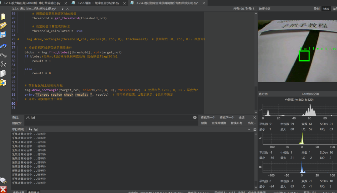 这里演示的是通过get_percentile获得LAB的前5%和95%数据然后自动计算累计平均值实现,效果并不一定是最好效果,但是对于一般黑线或者光照比较稳定条件下已经够用。其他章节还会提供更多阈值调试方法。openmv教程合集 openmv入门到项目开发 openmv和STM32通信 openmv和opencv区别 openmv巡线 openmv数字识别教程LCD。先去识别获得阈值,正在获得绿色