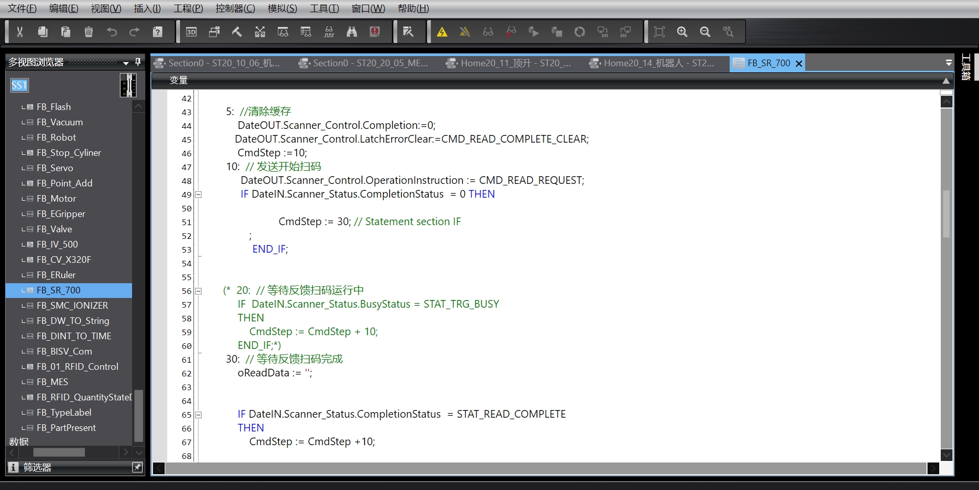 汽车发动机装配站,涵盖人机配方一键换型功能,故障记录功能,产量统计及OEE功能,TCP,视觉通信控制,EIP远程IO通信,松下A6总线伺服控制,优质的触摸屏程序模板,欧姆龙强大的结构体等应用,气缸报警功能块,真空报警功能块,伺服控制功能块,相机控制功能块,等等。欧姆龙NX系列PLC,普洛菲斯人机界面,搭载EtherCAT远程输入输出IO模块 ,多站EIP以太网标签变量通信,电子光栅尺应用,相机视觉