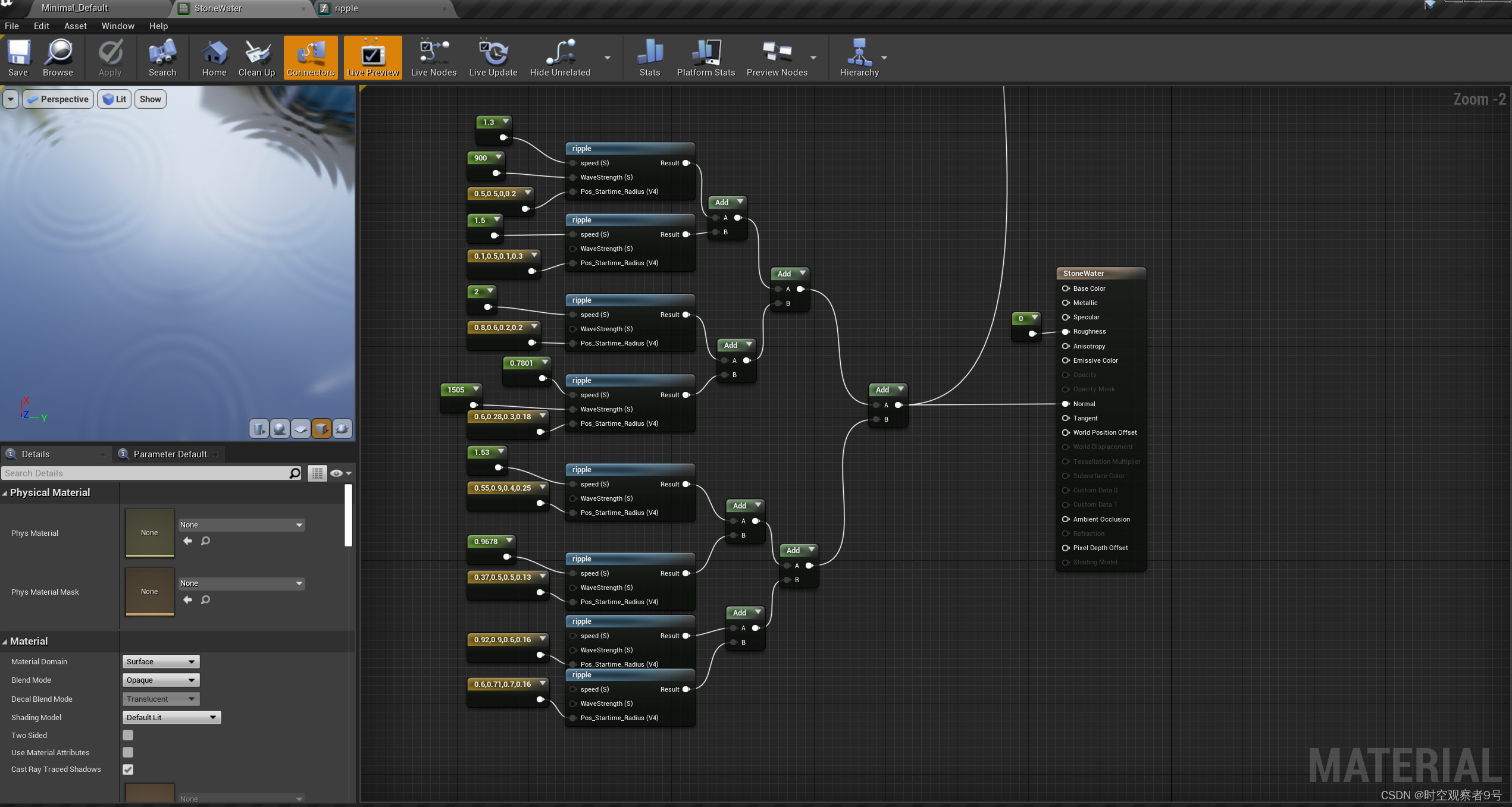 上面的做法有几个问题:1,用于地形时,显示不出来。原因是地形的UV是会超出1的,做如下修正:2,水波在UV边界被截断,暂不处理了,有几个办法:不让水波出现在UV边界上,或在世界空间指定水波位置,在二个相邻的水块中分别为半个水波指定发射位置,使两个块的水波在边界刚好对接成一个完整水波。...