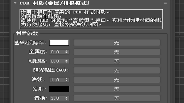 PBR材质是一种基于物理的渲染材质,可提供灯光与曲面交互方式的精确表示。注:仅当活动渲染器支持时,该材质才会显示在“材质/贴图浏览器”中。PBR材质分为PBR材质(金属/粗糙模式)和PBR材质(高光反射/光泽)。