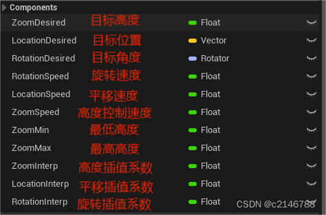 上一篇文章完成了一些基础的设置,这篇文章主要来设置一下摄像机。摄像机的控制主要有鼠标滚轮控制缩放,WASD键控制前后左右移动,QE键控制左右旋转。摄像机设置首先打开BP_Pawn,然后添加Spring和Camera组件。层级关系如下图我们把摄像机放到弹簧臂下面,这样摄像机就能跟着弹簧臂变换了。弹簧臂是个很有用的东西,有了它我们设置摄像机就变得容易了很多。想当年学Unity的时候,自己写代码去控制摄