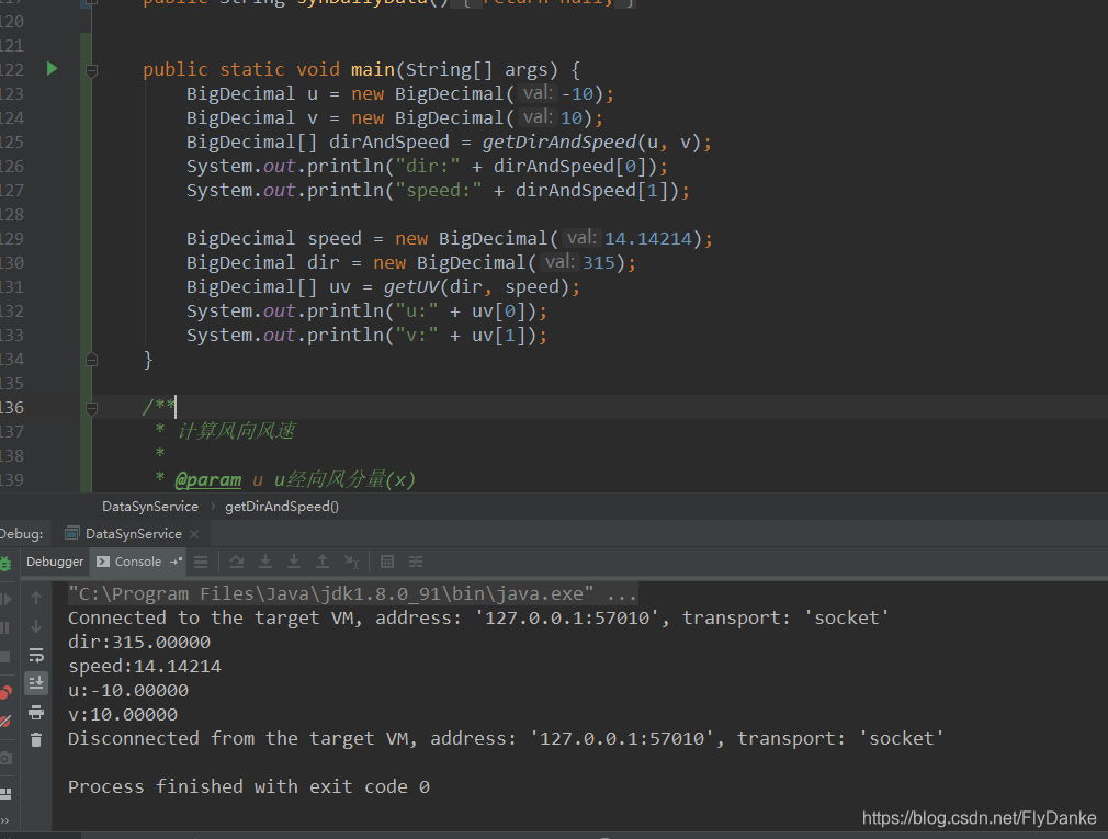 代码如下public static void main(String[] args) {BigDecimal u = new BigDecimal(-10);BigDecimal v = new BigDecimal(10);BigDecimal[] dirAndSpeed = getDirAndSpeed(u, v);...