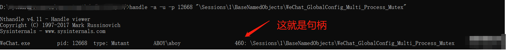 在软件中我们可以找type 是Mutant 的 然后右键有个关闭 一个一个试 这里我已经试过了就不演示了 直接给大家name到这一步之后 这个工具的使命就完成了!接下来该使用handle了在cmd 输入下面的代码然后我们在去关闭下这个句柄就可以了注意:这句代码需要管理员权限然后我们再去打开微信就可以了。下面我们用python去实现下代码可能和分析不太一样 因为中的1 有时候会变成其他数字,所以我用