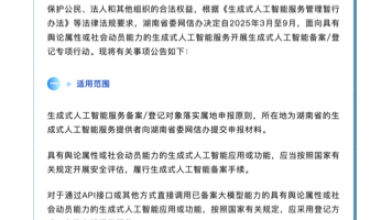 为促进生成式人工智能健康发展和规范应用,维护国家安全和社会公共利益,保护公民、法人和其他组织的合法权益,根据《生成式人工智能服务管理暂行办法》等法律法规要求,湖南省委网信办决定自2025年3月至9月,面向具有舆论属性或社会动员能力的生成式人工智能服务开展生成式人工智能备案/登记专项行动。根据《生成式人工智能服务管理暂行办法》规定,提供具有舆论属性或社会动员能力的生成式人工智能服务的,应当按照国家有