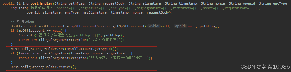 解决方案:校验及处理前使用WxMpConfigStorageHolder.set()方法修改为所需公众号配置。原因:WxMpService.checkSignature()方法获取的微信公众号配置总是默认公众号的配置。场景:springboot项目引用weixin-java-mp依赖进行多微信公众号相关业务处理。问题:配置多个公众号,接收微信请求时校验偶现异常。校验及处理结束后,删除set配置(可