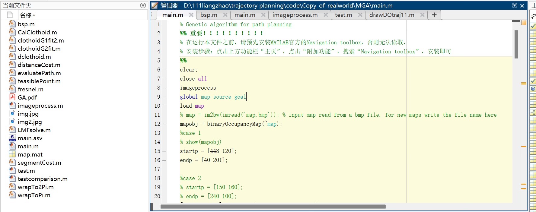 基于遗传算法GA和Clothoid曲线平滑的路径规划代码,适合无人机,无人船,无人驾驶汽车,移动机器人。在真实环境下,读取高德地图,并且规划路径,可自行选择新地图和设定起点和终点。请预先装好navigation toolbox,安装教学在main函数中。路径优化,路径平滑跑出来的结果如下图所示:在智能载具领域,路径规划一直是核心问题,无论是无人机翱翔天际、无人船畅游江河,还是无人驾驶汽车行驶在道路