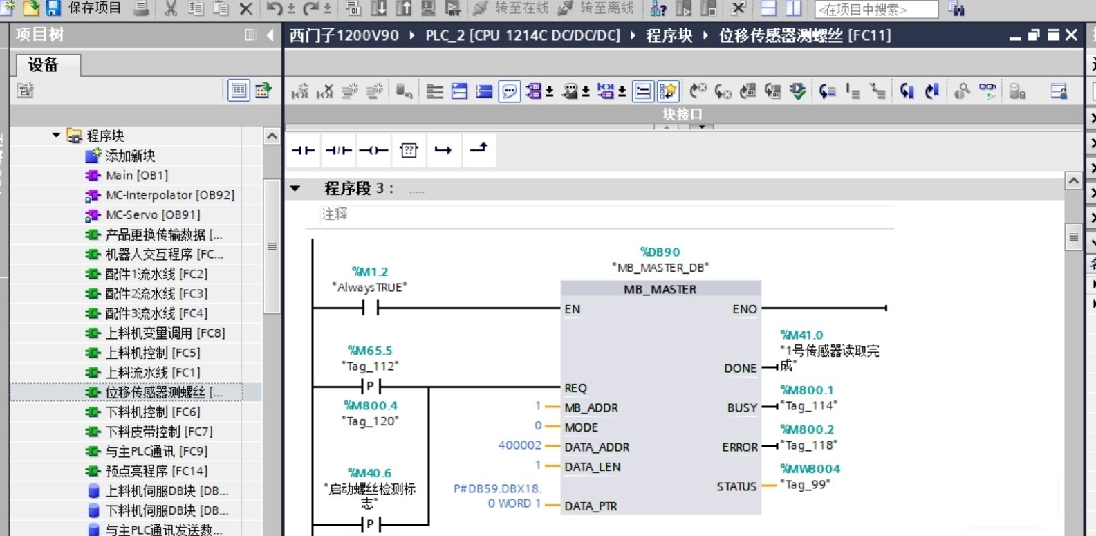 西门子PLC S7-1200程序实例,博图版本V15,仅供电气编程者学习借鉴,如有需要也可帮忙代写程序1,西门子1200与安川机器人TCP/IP通讯,包含机器人GSD文件;2,西门子1200控制6轴伺服电机,四台台脉冲控制台达B2伺服,两台PN通讯控制西门子V90伺服电机;3,两台西门子1200开放式通讯交互数据联动;4,与4台位移传感器modbus485轮询读取参数;5,本程序为本人自己编写,仅