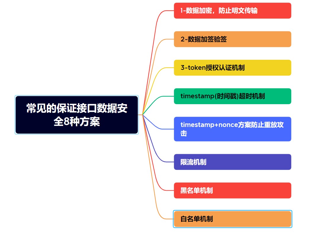 那么有哪些常见的保证接口数据安全的方案呢?1. 数据加密,防止报文明文传输。2. 数据加签验签3. token授权认证机制4. 时间戳timestamp超时机制5. timestamp+nonce方案防止重放攻击6. 限流机制7. 黑名单机制8. 白名单机制