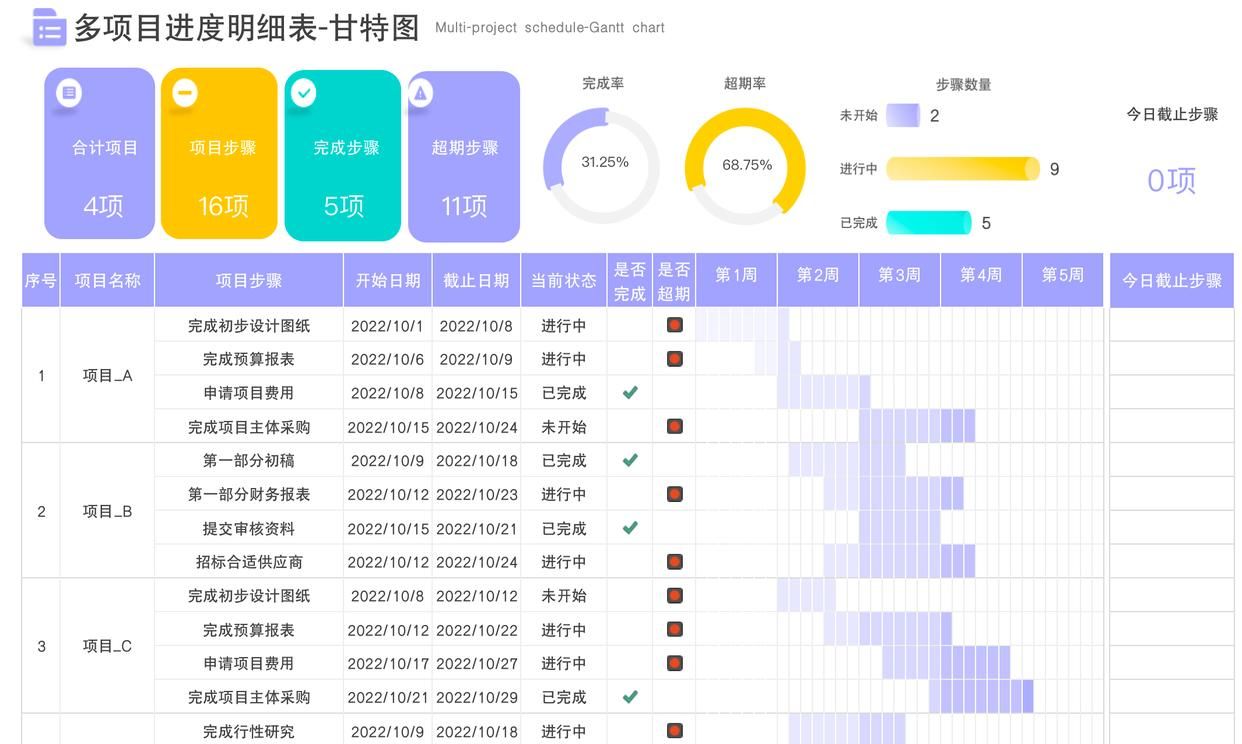 甘特图可以根据时间、成本、数量和质量来预测结果,综合考虑人力、资源、日期、重复因素和项目的关键部分,并将各个方面的甘特图集成到一张总图中,可以使企业日程进度一目了然,实现企业资源的高度利用,因此在现代管理中,越来越多企业也配备了甘特图。甘特图创建完成后,管理者可以根据项目的进度实时更改甘特图数据,项目状态同步到团队,成员就可以根据项目状态来调整自身的工作和服务,提升项目交付的质量,提高工作效率。其