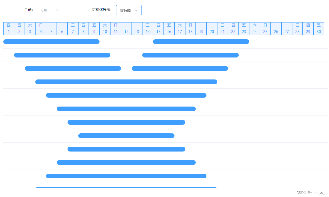 { width: ${(dates.length + 5) * itemWidth}px }”,给每一项都赋予宽度,这个 + 5 就是侧边栏的宽度。实际宽度:(结束日期在数组中的位置 - 起始日期在数组中的位置 + 1)x 每个日期的宽度(itemWidth),宽度需要加一个单位,这很好理解吧,假设起始日期在0位置,结束日期在1位置,1 - 0 = 1,而实际占了两个位置,所以需要 + 1。ite