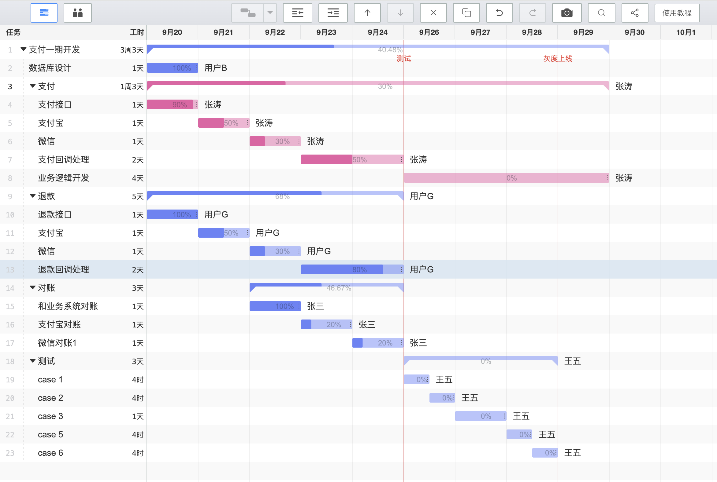 在制作甘特图时,要清晰标注任务的先后顺序关系,计算每条路径所需时长,以及任务的等级,重要的任务应该用醒目的颜色标签标记出来。zz-plan的快照可以通过对比计划进度和实际进度,就能及时发现偏差并分析原因,从而调整后续工作方式,避免风险持续扩大。甘特图对发现项目中潜在的关键路径和高风险任务,解决资源分配冲突,实时跟踪进度偏差起到了重要作用。掌握了这些利用甘特图的实战方法,相信能助你把控项目风险,化解