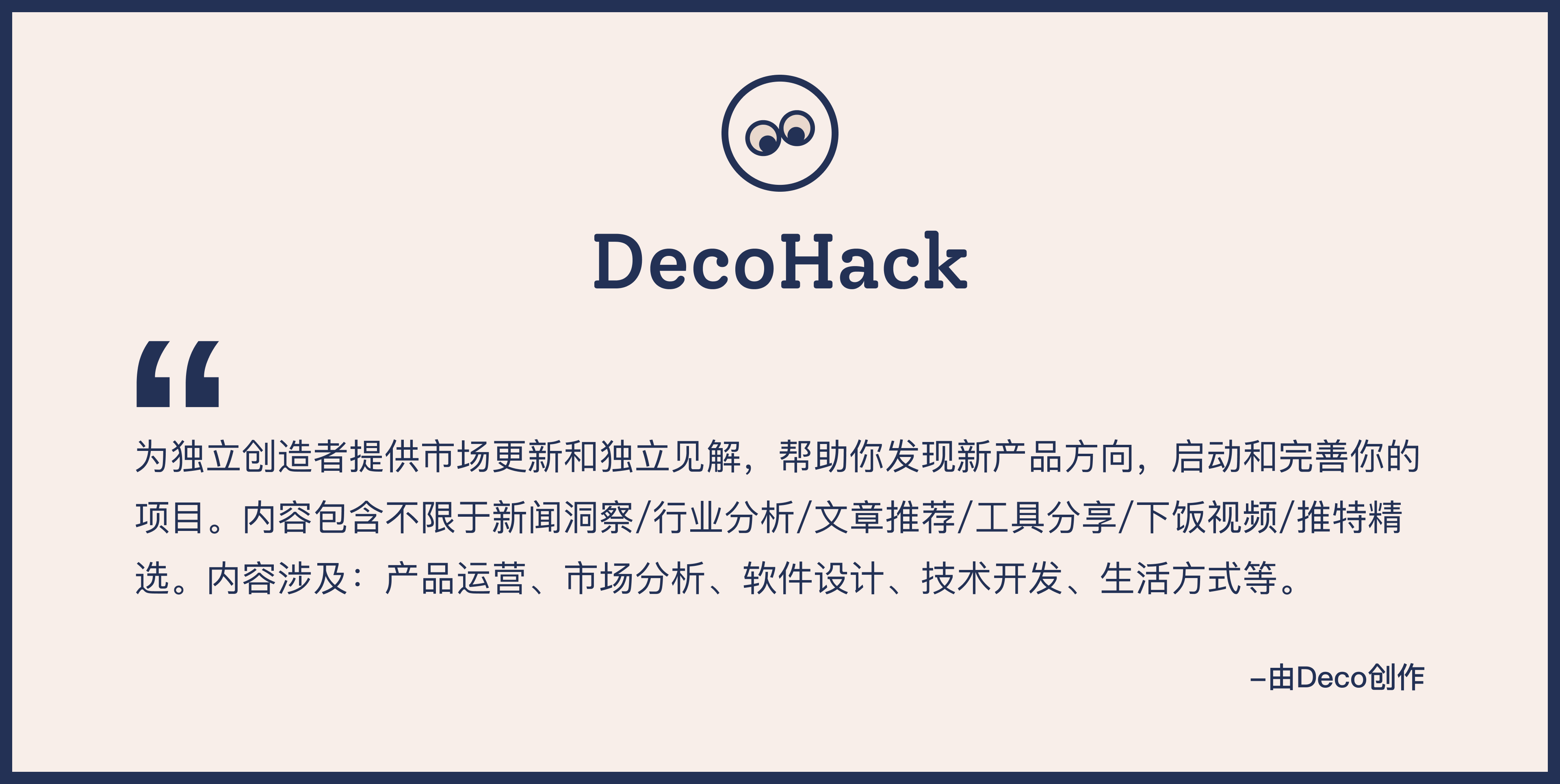 DecoHack的定位是帮助独立开发者发现新产品方向(国内国外),帮助有想法的人设计制作和运营自己的互联网产品,打造持续被动收入,体现个人价值。希望国内的独立互联网创造者拓展自己的能力范围:需求洞察能力,行业分析能力,产品思维,产品设计方法流程,产品运营能力,产品上架公司注册等问题。我本职工作是一个互联网产品设计师,不过之前学的是软件开发专业,所以除了工作之外一直都在做一些产品设计和开发相关的事情