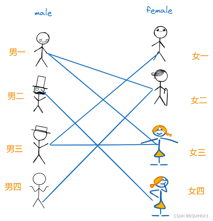 一、匈牙利算法(俗称“渣男算法”?)匈牙利算法是对于一个二分图的概念上求一个最大匹配。二、关于二分图什么是二分图?请看这个链接:二分图那什么是二分图的匹配和最大匹配呢?二分图的匹配:给定一个二分图 G,在 G 的一个子图 M 中,M 的边集 {E} 中的任意两条边都不依附于同一个顶点,则称 M 是一个匹配。二分图的最大匹配:所有匹配中包含边数最多的一组匹配被称为二分图的最大匹配,其边数即为最大匹配
