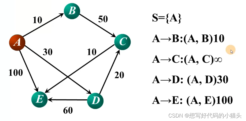 U为源点 S为未添加数组 邻接矩阵存放的是权值,创建dist[]数组,用来存放结点间的距离,首先将v结点加入U集合,之后更新dist[]数组的数值,再在U-S集合中找到一个权值最小的结点x,遍历x这一行,查看x到各个结点的距离,当x结点到m结点距离为5,此时用这个5去和dist[]数组到x的距离相加,如果相加得到的值比dist[]数组中的值小,则用这个值更新diist[]数组中到m中的权重值 ;